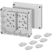 Kabelabzweigkästen aus hochwertigem Thermoplast. Für Aufputz-Anwendungen in Gebäuden oder die geschützte Installation im Freien, geeignet für die Kabelkanal- und Rohrinstallation. Durch ausschneiden der Kabelkanalwand und den beigefügten Einschubstopfen können die Kabel von vorn eingelegt werden, kein Fädeln notwendig. Deckelbefestigung mit V2A-Schrauben. Ohne Klemmen.