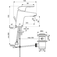 Einhebel-Waschtischarmatur DN 15. Starrer Gussauslauf Luftsprudler mit Metallring und Druckunabhängigen Mengenregler 5L/Min. Sockelmaß Durchmesser 47mm. Metall Zugknopf-Ablaufgarnitur G1 1/4. Ausladung 101 mm, Auslaufhöhe 68mm. Flexible Anschlssschläuche G 3/8. Bedienungshebel aus Metall. Permanente Rot- / Blau Markierung auf dem Bedienhebel. Befestigung von unten (EASY-FIX) mit Zentrierdichtung. Durchmesser 38mm Kartusche mit Keramischen Dichtscheiben. Schwenkbereich 100 Grad. Getestet auf 500.000 Zyklen (ein Zyklus besteht aus insgesamt 11 verschiedenen Hebelbewegungen). Integriertes Fettreservoir (lebensmittelverträglich). Integrierte Heißwassertemperaturbegrenzung. Lebensdauertest EN 817. Geräuschverhalten DIN 4109, Gruppe 1. Oberfläche: Chrom Gesamte Ausladung: 149 mm Gesamte Höhe: 133 mm Durchfluss (3 Bar): 5 L Hersteller: Ideal Standard Serie: Ceraflex Artikel Nr.: B1708AA