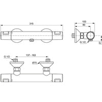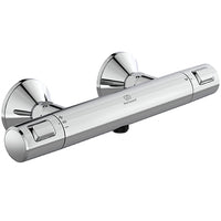 Brausethermostat AP DN15. Rückflussverhinderer. DVGW-Eigensicher. Cool Body. S-Anschlüsse verdeckt mit konischen Metallrosetten (verstellbar von 137 - 163 mm). Ausladung 80 mm. Kunststoffgriffe. Thermostatkartusche mit Wachsdehnstoffelement. Anti-Kalk-Funktion. Heißwassertemperatureinstellung mit Verbrühschutz. Wassermengenregulierung mit ECO-Spartaste und keramischen Dichtscheiben.RV Patrone auf der Warmwasserseite mit integriertem Überdruckventil. Dient zur Druckentlastung (Schutz der Armatur) bei Drücken größer 16 Bar. Geräuschverhalten DIN 4109, Gruppe 1. Farbe / Oberfläche: Chrom Gesamte Ausladung: 100 mm Gesamte Breite: 315 mm Durchfluss (3 Bar): 22 Liter Gewicht: 1,1 kg Hersteller: Ideal Standard Serie: CeraTherm T25 Artikel-Nr.: A7201AA